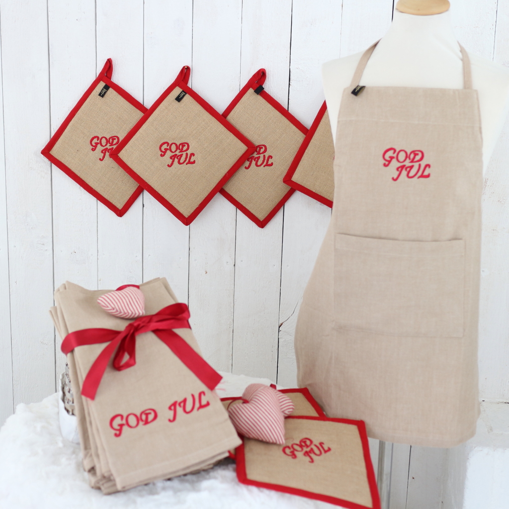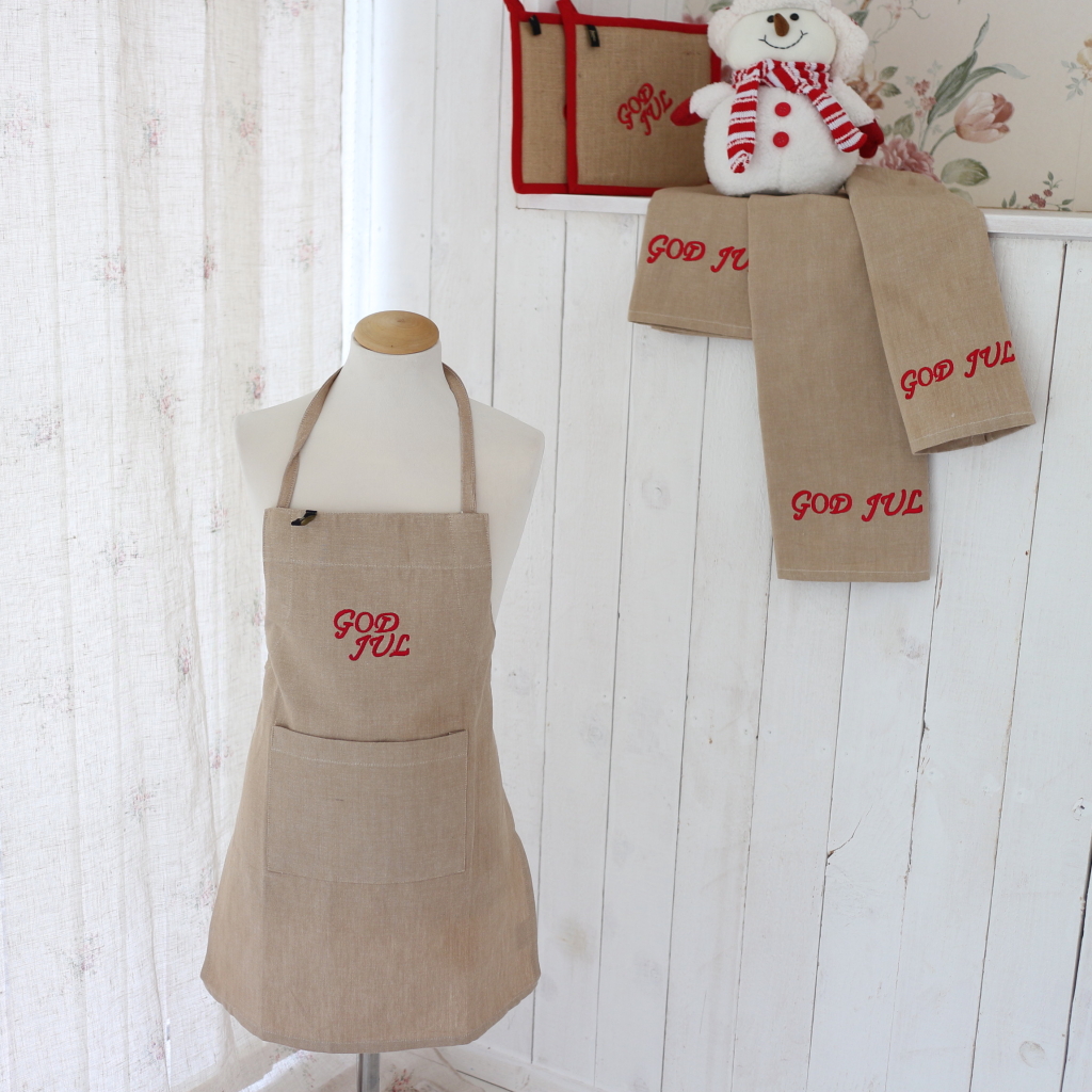 Beige chambrey med broderad text god jul.