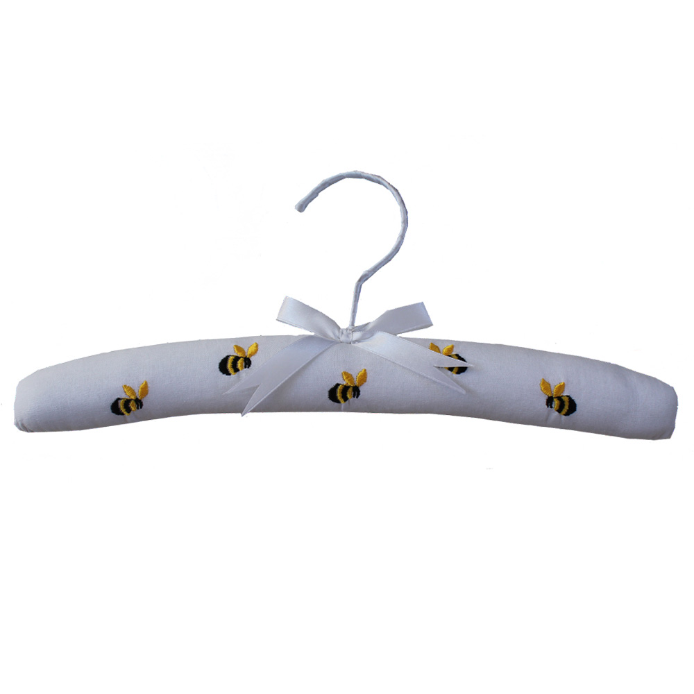 Vadderad med vackert brodyr med humlor som sött mönster med dekorativt tvinnat sidenband runt hängaren med rosett som avslut
