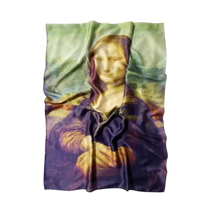 Låt konsten bli en del av din stil med vår exklusiva scarf i storlek 70 x 180 cm, prydd med det ikoniska motivet Mona Lisa av Leonardo da Vinci. Ett tidlöst mästerverk möter modern elegans i ett vackert multifärgat mönster med grön bas, som ger liv och djup åt varje outfit.