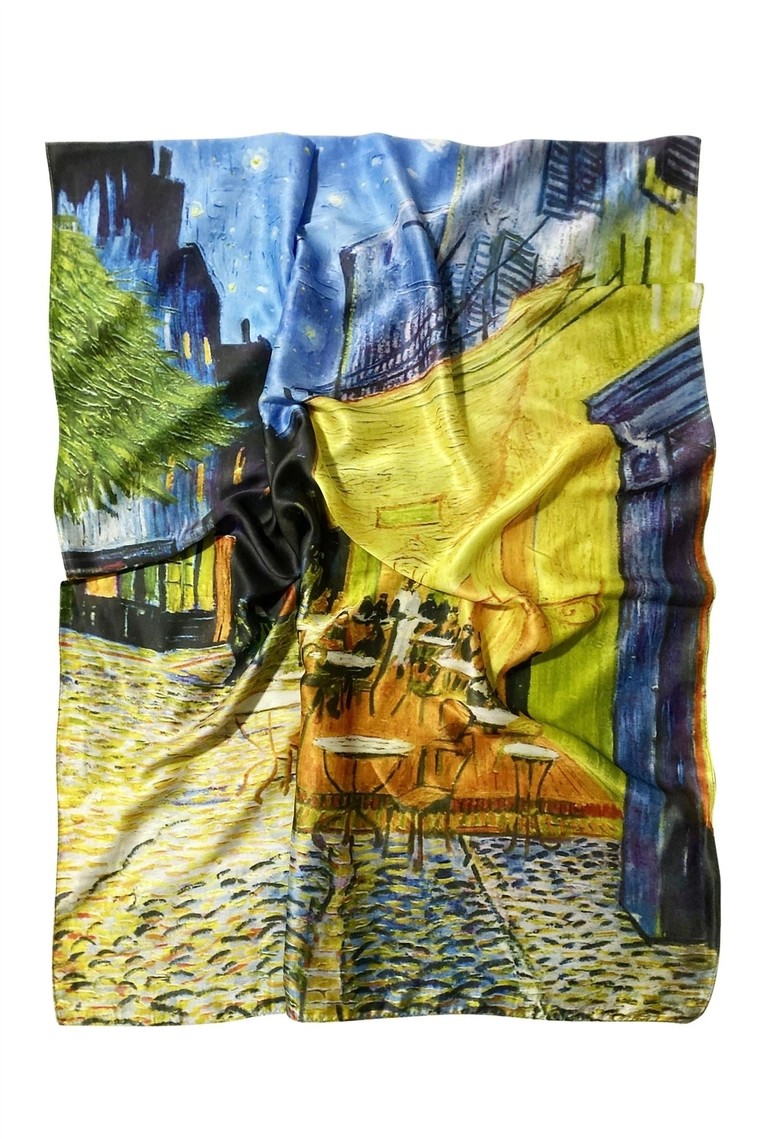 Låt färg och känsla ta plats med vår eleganta scarf i 70 x 180 cm, inspirerad av Vincent van Goghs ikoniska målning “Terrace at Night”. Det uttrycksfulla konstverket kommer till liv i ett multifärgat mönster med varm gul bas, som sprider ljus, energi och konstnärlig karaktär.