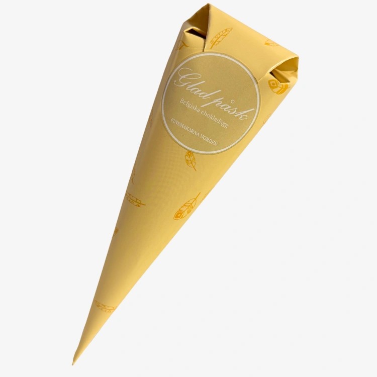 Celebrate Easter in style! 🌼 Our beautiful yellow cone with the text Happy Easter tecxt in swedish Glad Påsk is filled with hand-decorated Belgian egg halves in white, light and dark chocolate – a perfect combination of taste and festive feeling.