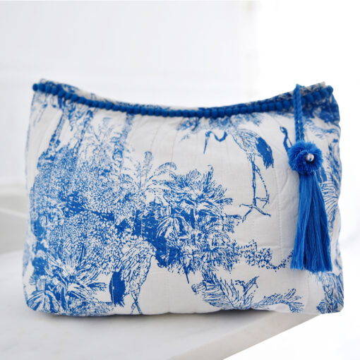 This beautiful, printed wash bag will add an elegant touch to any bathroom. The toile de jouy style print has a gorgeous blue safari scene with luscious palms, prowling tigers and elegant crane birds all set against a crisp white background. The bag is embellished with a blue pom-pom trim and a pearl-trimmed tassel on the zip pull is the finishing touch!