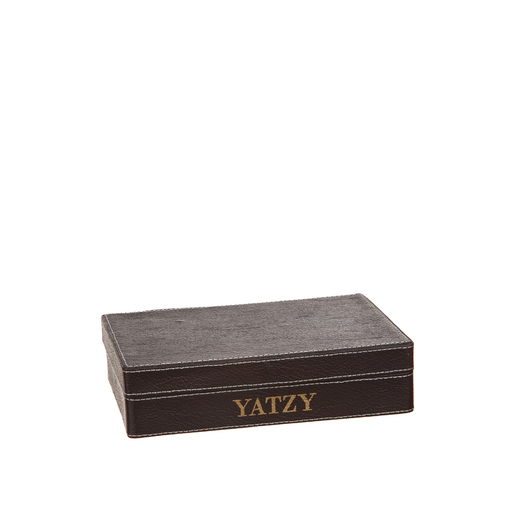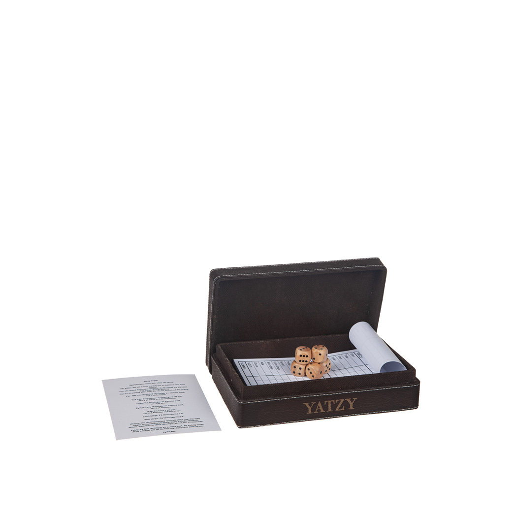 Förhöj spelstunden med elegans! Vårt Yatzy-set kombinerar klassiskt spel med modern, stilren design. Tillverkat i mörkbrunt konstläder och med måtten 13 x 20 cm, är det både kompakt och exklusivt. Inkluderar spelblock och tärningar – redo att användas direkt.