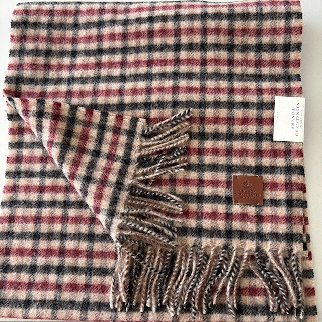 Halsduken har dekorativt smårutigt mönster med fransar på kortsidorna med en läderpatch med stansad logotype.