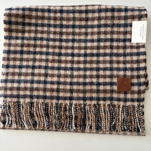 Halsduken har dekorativt smårutigt mönster med fransar på kortsidorna med en läderpatch med stansad logotype.