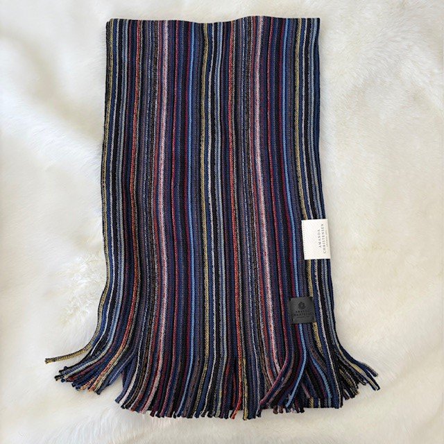 Stilfull randig halsduk i multifärger med blåa inslag. Halsduk med ränder i olika färger tillverkad i en mjuk ullkvalitet med fransad kant.