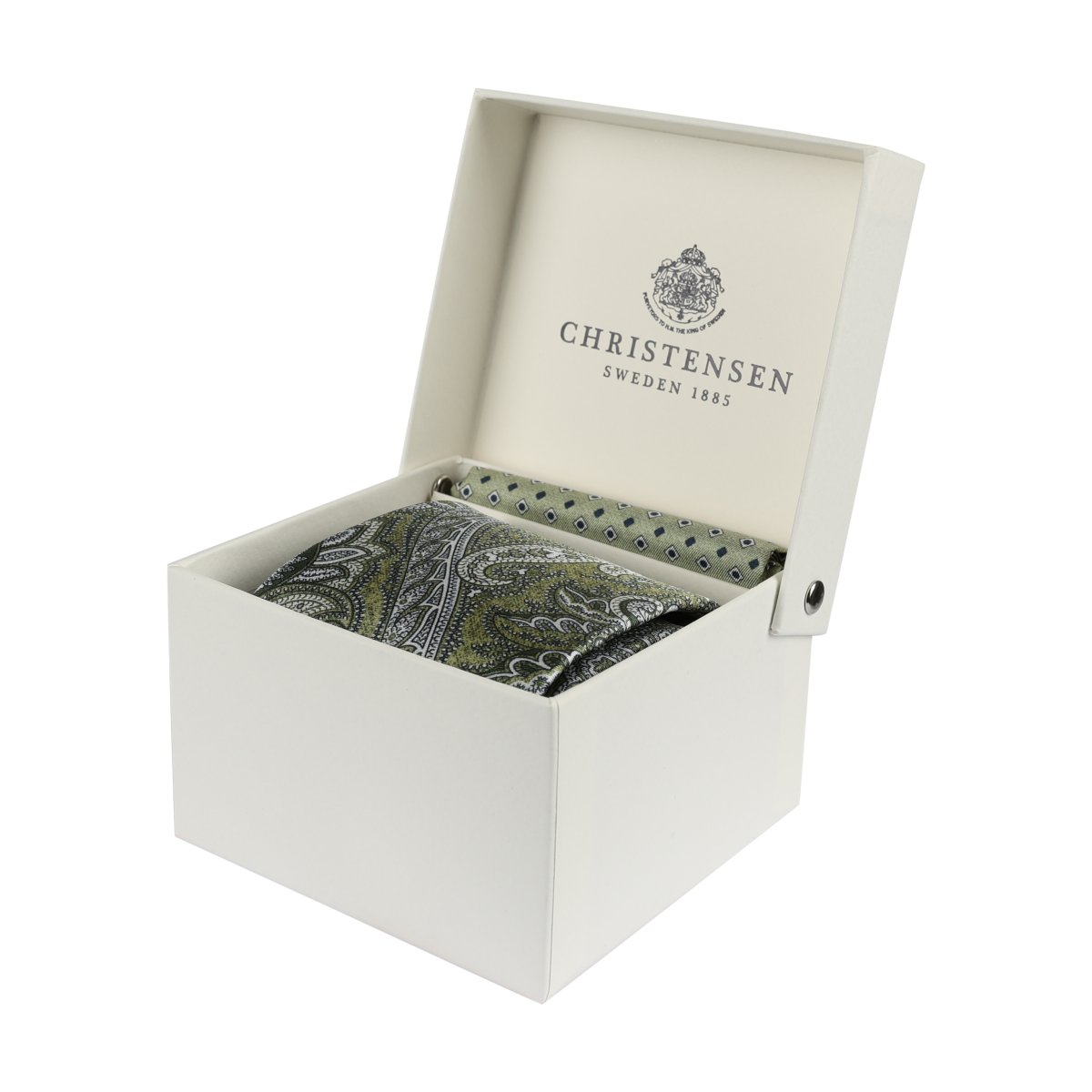 Box med en klassisk slips och en matchande näsduk för bröstficka på kavajen i 100% linne i grön melange färgskala.