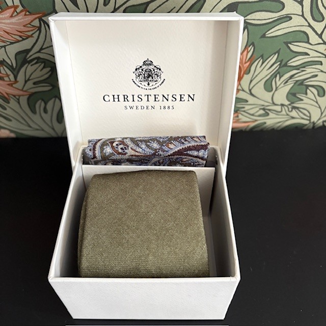 Både slips och näsduk är tillverkade i ulloch går i färger som harmoniserar väl med varandra.