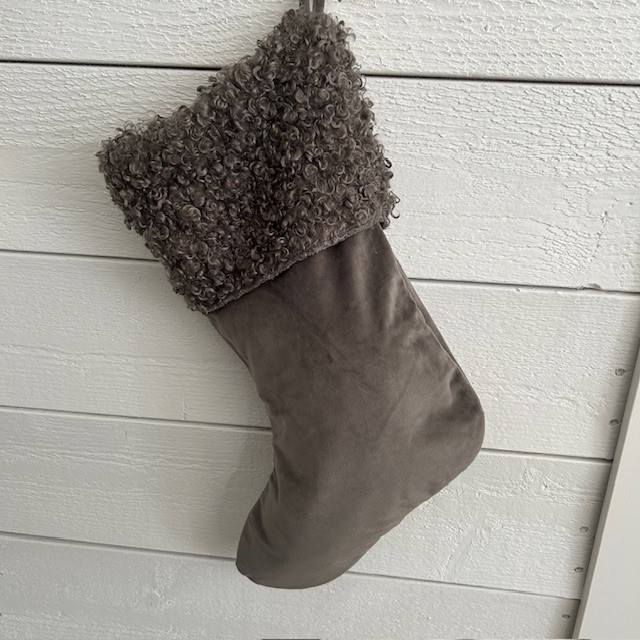 Dekorativ julstrumpa i härlig design med vacker lyster i sammetsliknande material med matchande krullig fuskpäls i grått.