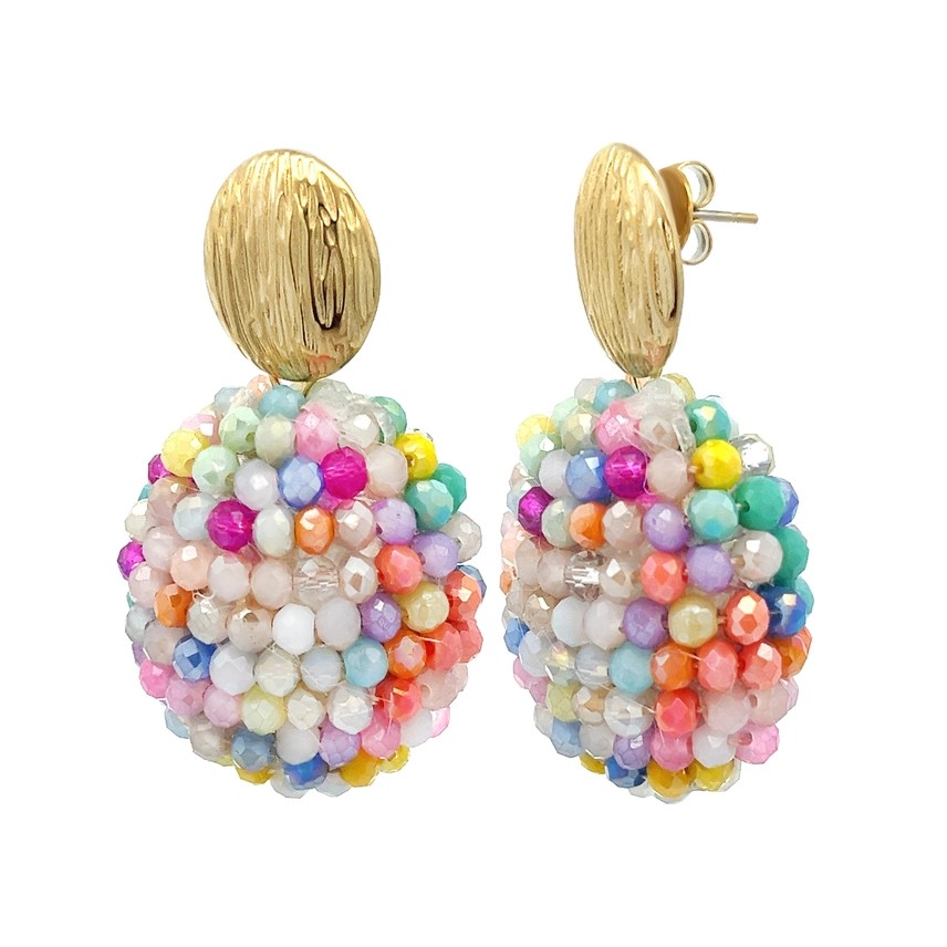 Underbara örhängen i multi färg som en klase med pärlor runt om med guldfärgad platta med relifmönster