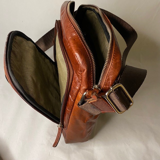 Klassisk skinnväska / messingerbag i kalvskinn - unisex med reglerbar axelrem med dragkedja upptill i hög kvalitet.