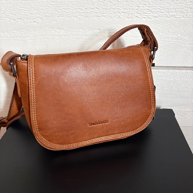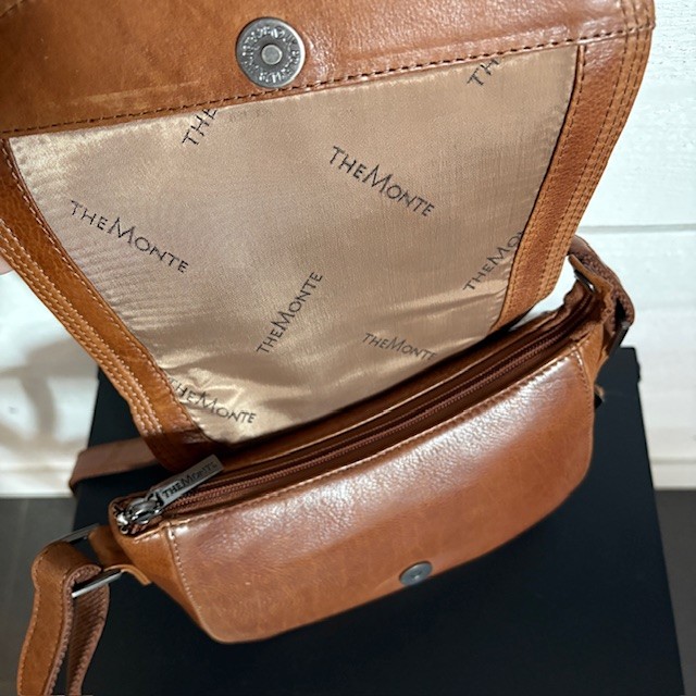 Upptäck Flapbag Tuscany från The Monte, en elegant handväska i rustikt buffelskinn med naturlig struktur. Den sadelinspirerade designen kombinerar stil och funktion med lock och magnetlås, dragkedja under locket och en diskret bakficka. Ljust foder inuti med smarta fickor och en justerbar axelrem med tyg på baksidan ger komfort och praktisk användning.
