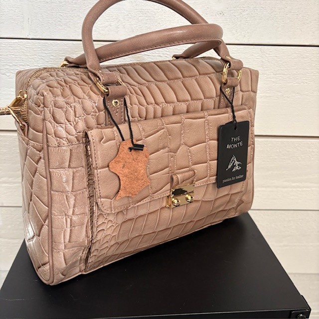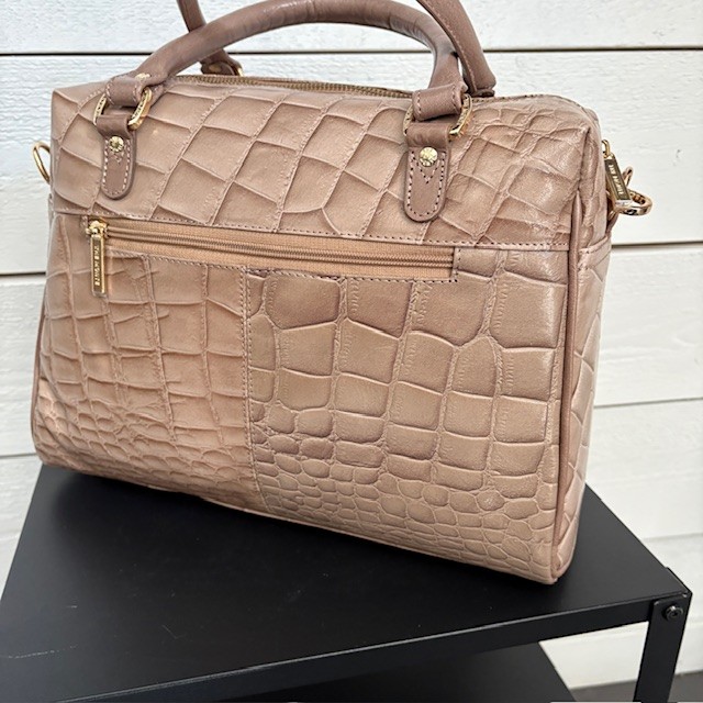 Vårt croco-präglande skinn är ett levande naturmaterial. Varje prägling har sitt eget unika mönster, vilket innebär att ingen väska är den andra exakt lik. Variationer i struktur och utseende är en naturlig del av skinnets karaktär och bidrar till att göra varje produkt helt unik.