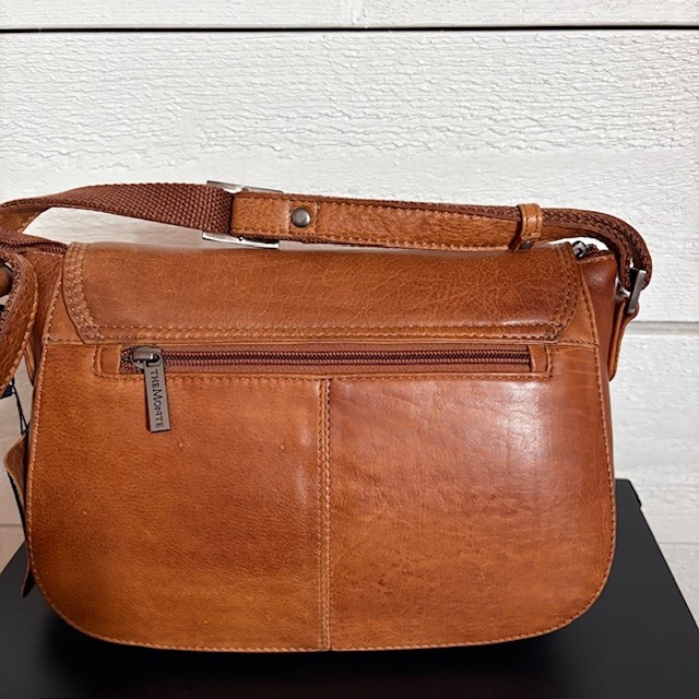 Upptäck Flapbag Tuscany från The Monte, en elegant handväska i rustikt buffelskinn med naturlig struktur. Den sadelinspirerade designen kombinerar stil och funktion med lock och magnetlås, dragkedja under locket och en diskret bakficka. Ljust foder inuti med smarta fickor och en justerbar axelrem med tyg på baksidan ger komfort och praktisk användning.